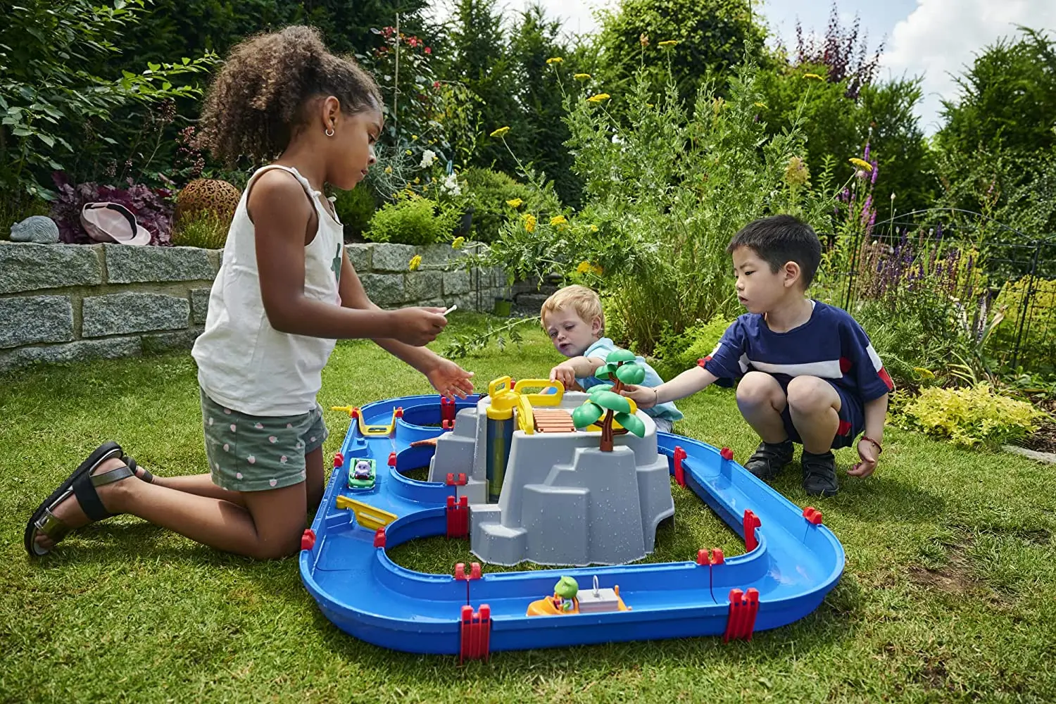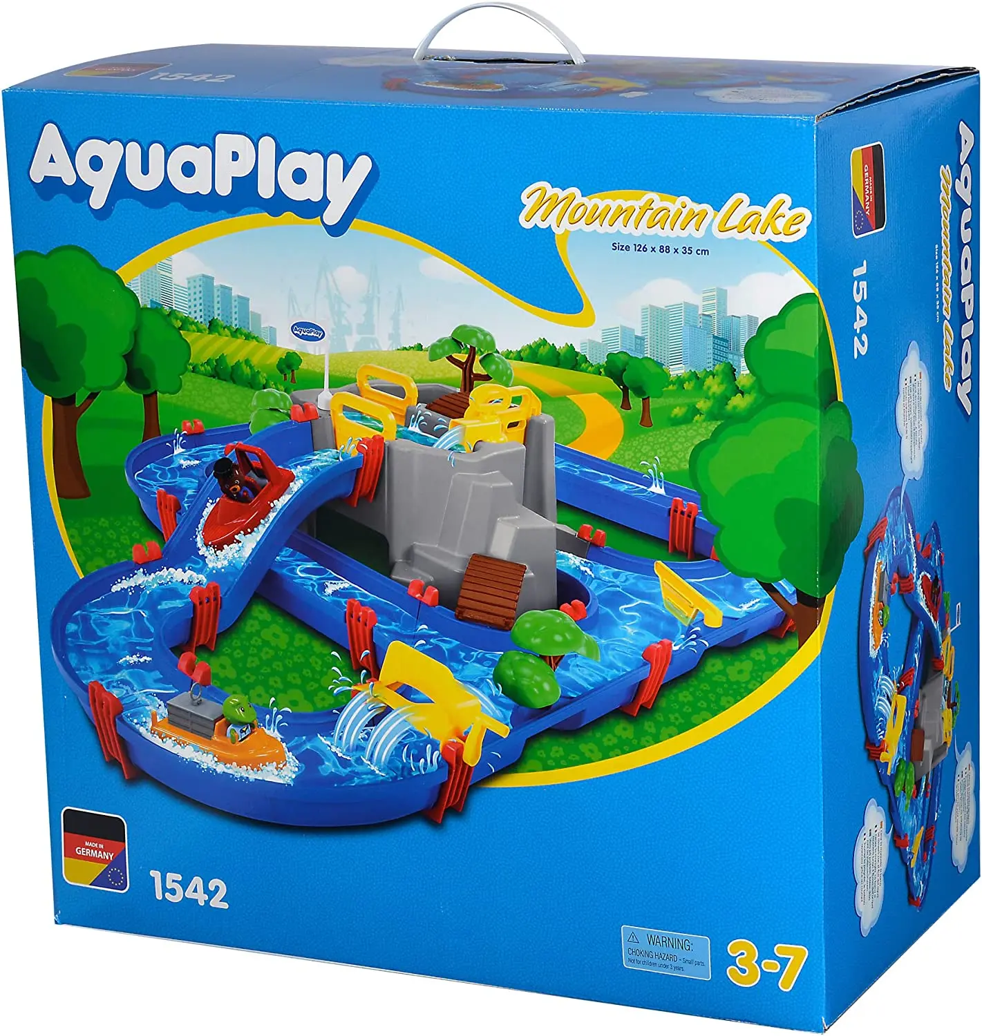 System kanałów wodnych dostarczy maluchom rozrywki na wiele godzin. Unikalna zabawka przedstawia górę wraz z otaczającym ją jeziorem. Dodatkowe atrakcje to: łódka motorowa, statek kontenerowy z pojedynczym kontenerem oraz trzy figurki zwierząt: kaczki Lotta, żabki Nils i niedźwiedzica Bo. Razem z tymi sympatycznymi zwierzakami dziecko odkryje jaskinię ukrytą w górze, będzie wspinać się po stromych klifach, spływać wodospadem w motorówce i szukać skarbów w kanałach. Wpraw wodę w ruch za pomocą koła łopatkowego i pomóż statkom przepłynąć przez ten ogromny, fascynujący system kanałów. Poziom wody i wysokość unoszenia się zabawek można kontrolować za pomocą pompy bądź poprzez otwieranie śluz. Zabawka w twórczy i żartobliwy sposób uczy dzieci o właściwościach i sposobie obchodzenia się z wodą.