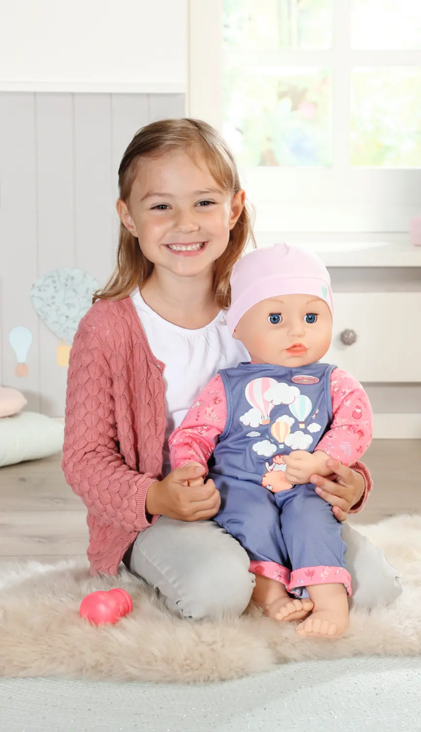 Lalka Baby Annabell o długości 54 cm to idealna towarzyszka dla każdego malucha. Dzięki dużemu rozmiarowi wygląda niezwykle realistycznie i przypomina prawdziwego niemowlaka. Jej uroczy strój, składający się z fioletowego pajacyka z nadrukiem kolorowych balonów i różowej czapeczki, zachęca do zabawy w opiekę nad dzieckiem. Lalka wyposażona jest w funkcję usypiania — kiedy ją położysz, zamknie oczy, sprawiając wrażenie, że zasypia. Jej miękki brzuszek sprawia, że jest idealna do przytulania. W zestawie znajduje się również butelka, dzięki której dzieci mogą symulować karmienie. Zabawa lalką Baby Annabell wspiera rozwój umiejętności społecznych, takich jak odpowiedzialność i empatia.
