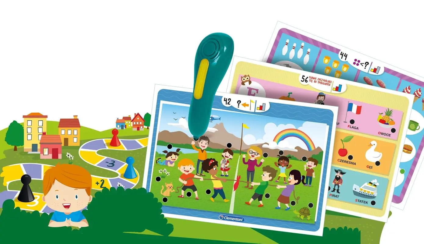 Zestaw edukacyjny zawierający 32 karty i 64 ćwiczenia, umożliwiające poznawanie liter, słów, liczb, wielkości, kształtów i kolorów. Ponad 1000 quizów, pozwalających dzieciom się sprawdzić; dzieci mogą również zmierzyć się z przyjaciółmi w grze planszowej dla 2 do 4 graczy, aby uczyć się w sposób bardziej zajmujący, co czyni tradycyjną grę bardziej ciekawą i stymulującą. Dzieci uczą się niezależnie dzięki mówiącemu długopisowi potwierdzającemu odpowiedzi, który prowadzi dzieci przez grę.