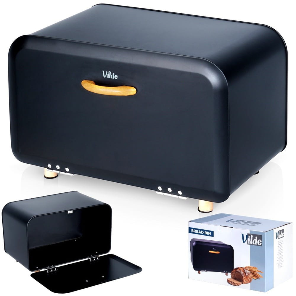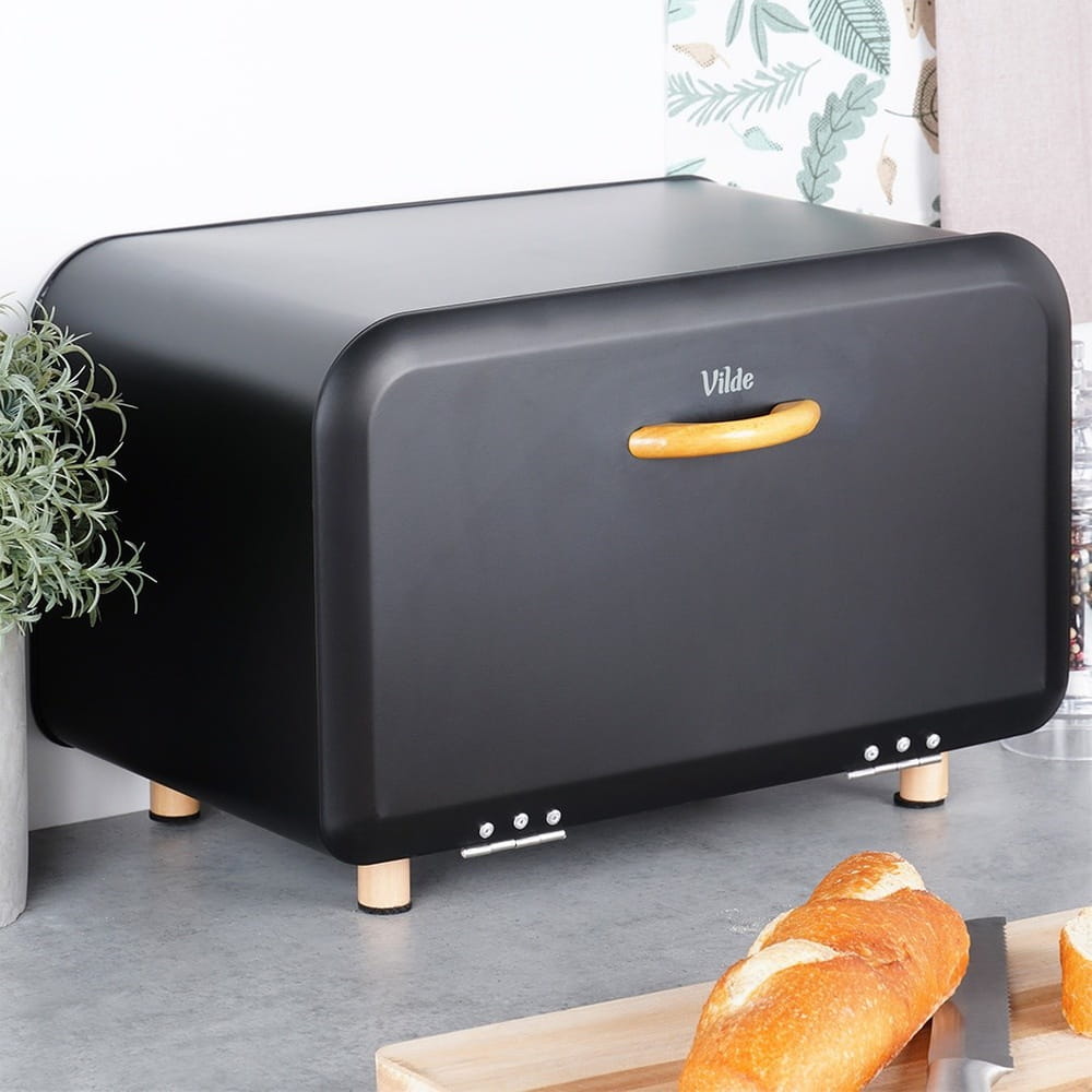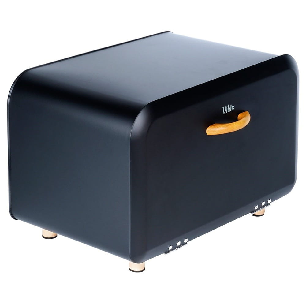 ✅ Wykonany z metalu - Chlebak wykonany z wysokiej jakości metalu malowanego proszkowo na czarny, matowy kolor. Posiada uchwyt wykonany z drewna, który dodaje nowoczesności. Dodatkowo chlebak posiada cztery drewniane nóżki, które posiadają podkładki filcowe. Metalowa konstrukcja skutecznie chroni pieczywo przed zgnieceniem i uszkodzeniami.
