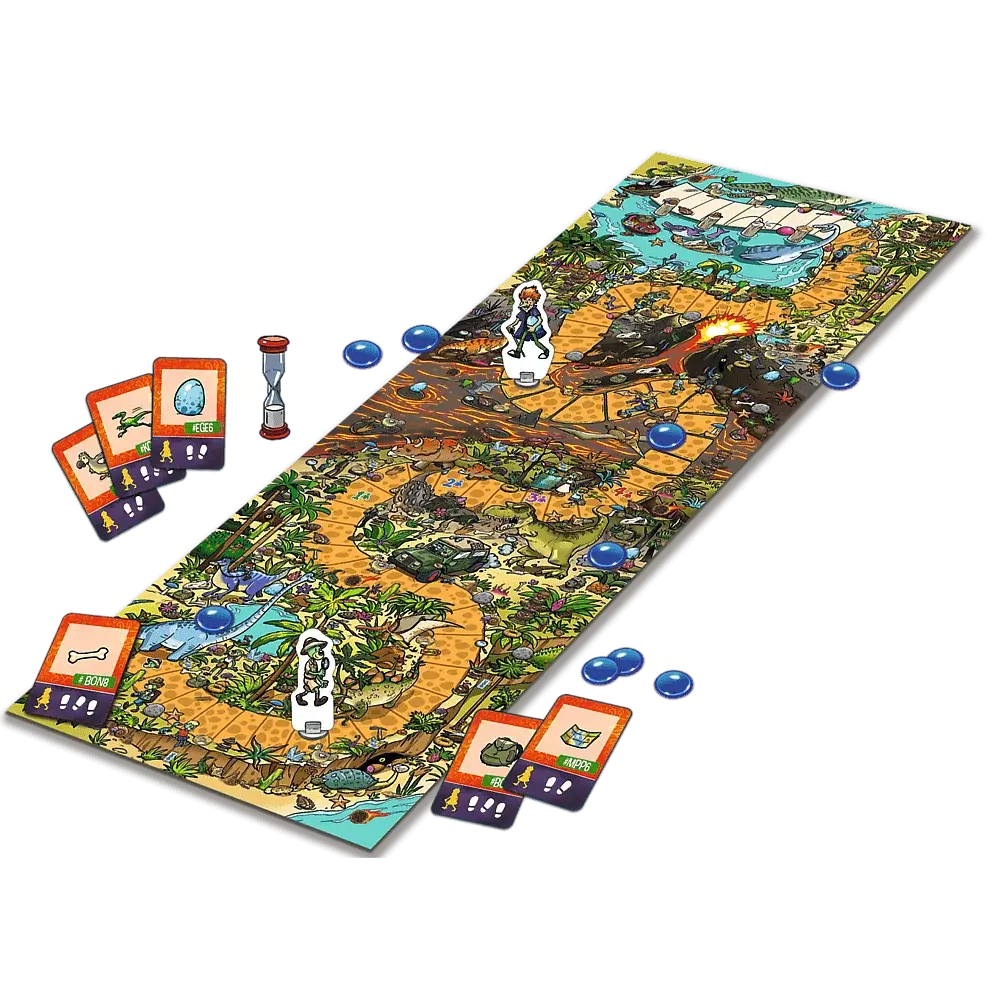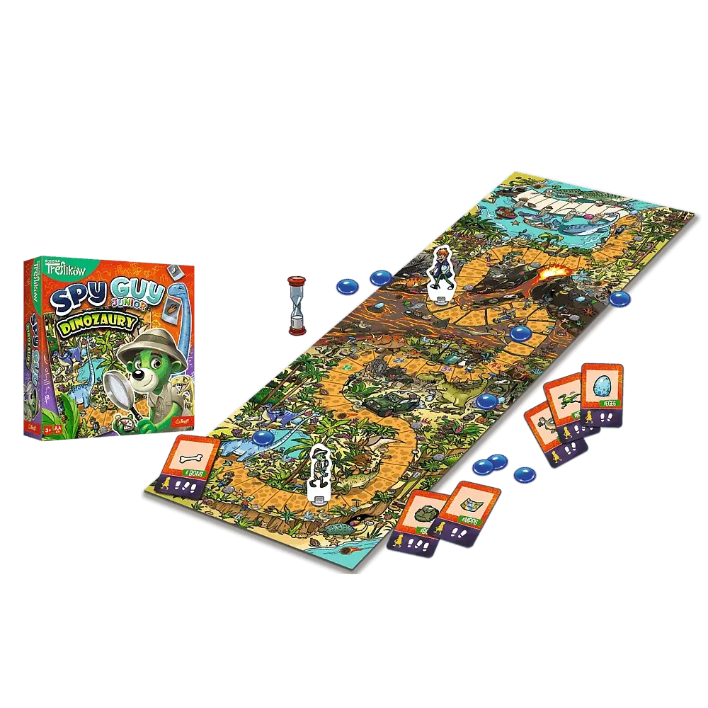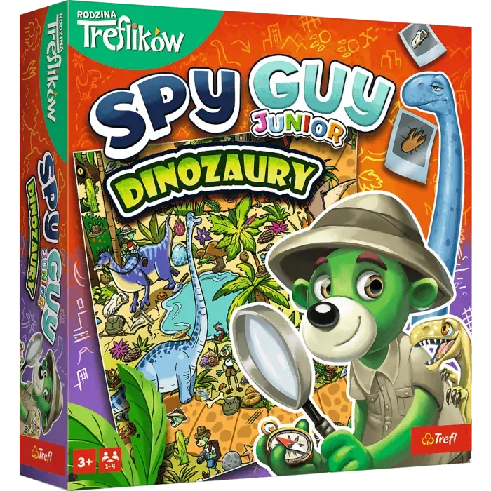 Spy Guy Junior Dinozaury to kooperacyjna gra, w której wcielacie się w rolę młodego detektywa. Spróbujcie schwytać złoczyńcę, nim ten ucieknie z parku dinozaurów z niezwykle rzadkim jajem brachiozaura. Ćwiczcie spostrzegawczość, umiejętność skupienia uwagi i współpracy, poszukując poszlak na barwnej, rysunkowej ponad metrowej planszy. Wersja Junior dedykowana jest młodszym graczom, dlatego, aby ułatwić poszukiwania, ilustracje są większe, a plansza mniej szczegółowa. Dodatkowo w opakowaniu znajdziecie atlas z dinozaurami występującymi na planszy. Spróbujcie odnaleźć je wszystkie i zapoznajcie się z ciekawostkami na ich temat.