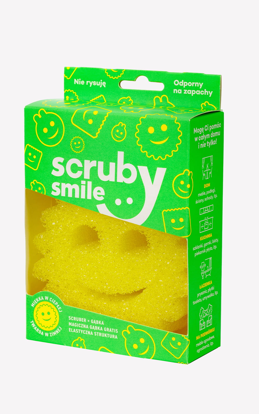 Scruby Smile to innowacyjna termo gąbka, która zmienia swoją twardość w zależności od temperatury wody. W zimnej wodzie staje się twarda i szorstka – doskonała do trudnych zabrudzeń, przypaleń i tłuszczu. W ciepłej wodzie mięknie – idealna do delikatnych powierzchni, szkła czy ceramiki. Sprzątaj bez użycia chemii – tylko wodą!