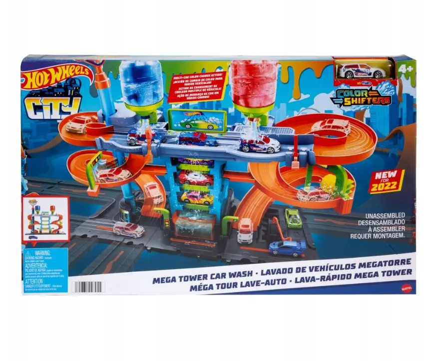 Zakręcona megamyjnia Hot Wheels City to pomysł na świetną zabawę! Podjedź do wyjątkowej myjni samochodowej i wjedź na sam szczyt obrotowej spirali. Na górze znajdują się dwa zbiorniki - z zimną i z ciepłą wodą. Spryskaj pojazd Color Shifters, aby zmienić jego kolor. Odpowiednio rozmieszczona taca zbiera skapującą wodę, więc nie musisz martwić się o bałagan. Przeżywaj niezapomnianą przygodę w Zakręconej megamyjni Hot Wheels City. W zestawie znajduje się 1 samochodzik Hot Wheels Color Shifters, który zmienia kolor w zimnej wodzie, a po kontakcie z ciepłą wodą wraca do swojego wcześniejszego wyglądu. Na środkowych miejscach można zaparkować nawet trzy dodatkowe samochodziki Color Shifters i jednocześnie zmienić ich wygląd! (Dodatkowe pojazdy sprzedawane oddzielnie). Zestaw jest wyposażony w mnóstwo elementów do zabawy, które nie wymagają wody - na przykład ruchome bramki, wałek z pianki oraz wąż do tankowania. Zakręcona megamyjnia Hot Wheels City to doskonały prezent dla dzieci od 4 roku życia. Można połączyć ją z innymi zestawami Hot Wheels, by zbudować własne miasto.