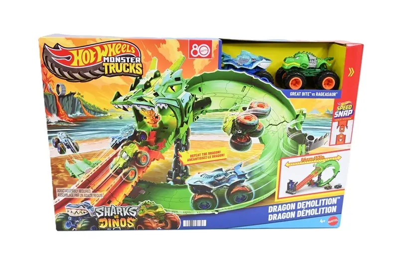 Smok nie ma szans, gdy do akcji ruszają potężne monster trucki! Zestaw Hot Wheels Monster Trucks - Smoczy wyścig to arena zmagań dwóch pojazdów, które startują równocześnie w podwójnej wyrzutni. Trasa prowadzi przez smoczy tor, a interaktywna zwrotnica w kształcie piły może zdecydować o losie zawodników – jeden zostanie zepchnięty, oba się zatrzymają, a może przejadą dalej? Gdy smok zostanie pokonany, można spróbować celnie wystrzelić pojazd do jego paszczy i zdobyć trofeum. Tor zapewnia dynamiczną zabawę z elementami zaskoczenia, a spektakularna konstrukcja z ruchomymi częściami urozmaica każdą rozgrywkę. Zawartość: - 1 zestaw do zabawy Hot Wheels Monster Trucks - Smoczy wyścig - 2 pojazdy - Great Bite i Rageasaur w skali 1:64.