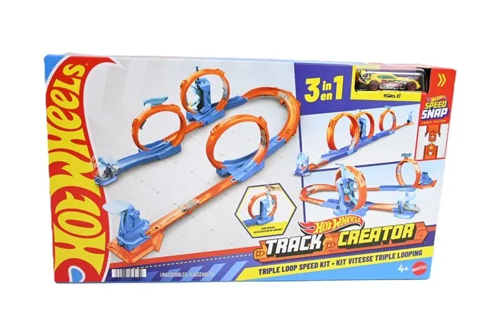 Zestaw Hot Wheels - Super tor potrójna pętla pozwala na budowanie różnorodnych konfiguracji torów wyścigowych z wykorzystaniem trzech pętli i licznych elementów torowych. Dzięki systemowi Speed Snap Szybki klik elementy można łatwo łączyć, a dołączone adaptery umożliwiają integrację z wcześniejszymi zestawami Hot Wheels. W zestawie znajduje się metalowy samochód w skali 1:64, który można wykorzystać do testowania różnych układów toru, w tym pętli z przyspieszaczem oraz torów z zakrętami i prostymi odcinkami. Zawartość: - 2 pętle, - 1 pętla z przyspieszaczem, - 1 wyrzutnia, - 1 zakręt 180°, - 2 tory po 30 cm, - 2 krótsze tory po 15 cm, - 2 adaptery - 1 metalowy samochód zabawka w skali 1:64.