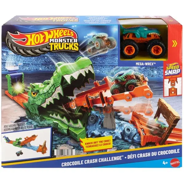 Tor Hot Wheels Monster Trucks „Paszcza Krokodyla” to widowiskowe wyzwanie, w którym liczy się precyzja, timing i odrobina odwagi. Centralnym punktem zestawu jest ogromny krokodyl z otwartą paszczą, nad którym monster truck musi wykonać efektowny skok. Każdy start z wyrzutni to moment napięcia – odpowiednia siła napędu decyduje o tym, czy pojazd bezpiecznie przeleci nad przeszkodą, czy wpadnie prosto w szczęki drapieżnika. W zestawie znajduje się pojazd Mega-Wrex w skali 1:64 z charakterystycznymi, dużymi kołami, gotowy do akcji od razu po złożeniu toru. Samochód rozpędza się po rampie, przelatuje nad krokodylem i ląduje na ruchomym moście, który może „znokautować” przeciwnika przy poprawnym przejeździe. Mechanizm resetowania pozwala szybko wrócić do zabawy i podejmować kolejne próby bez długich przerw. Zestaw jest kompatybilny z elementami systemu Speed Snap (adaptery sprzedawane osobno), co umożliwia rozbudowę trasy i tworzenie jeszcze dłuższych, bardziej wymagających torów. Produkt przeznaczony jest dla dzieci od 4. roku życia. Wymagany montaż przez osobę dorosłą.