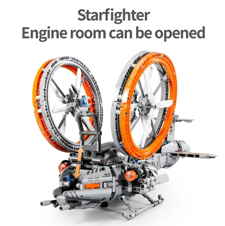 Przygotuj się na niekończące się godziny zabawy i kreatywności dzięki najnowocześniejszym klockom konstrukcyjnym, które ożywią Twoje marzenia! Niezależnie od tego, czy jesteś entuzjastą samochodów, czy fanatykiem robotów, ta rewolucyjna, nowa marka klocków konstrukcyjnych jest tutaj, aby przenieść zabawę na zupełnie nowy poziom! Klocki przedstawiają Gwiezdny myśliwiec - Futurystyczny model science-fiction. Kokpit otwiera się swobodnie, a śmigła można ręcznie obracać. Zestaw składa się z 817 elementów.