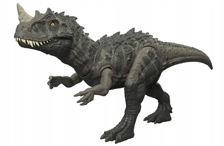 Prehistoryczny drapieżnik z charakterystycznym rogiem na pysku przenosi akcję prosto do świata Jurassic World. Ceratozaur został wyposażony w funkcję ataku z kłapiącą paszczą oraz realistyczny, dziki ryk, który uruchamia się po naciśnięciu przycisku. Efekty dźwiękowe i świetlne potęgują wrażenie starcia, a wyrazista rzeźba ciała oraz detale skóry nadają figurce filmowy charakter. Zabawa pozwala odtwarzać sceny znane z ekranu lub tworzyć własne przygody w świecie dinozaurów. Ruchome kończyny, ogon oraz głowa umożliwiają ustawianie figurki w różnych pozach bojowych, co rozwija wyobraźnię i zachęca do dynamicznej zabawy fabularnej. Mechanizm ataku Mega Chomp sprawia, że każde starcie wygląda bardziej realistycznie i angażuje dziecko w odgrywanie emocjonujących historii. Model ma około 32 cm długości i przeznaczony jest dla dzieci od 4. roku życia. Na łapie znajduje się karta z kodem do zeskanowania w dedykowanej aplikacji, która pozwala rozszerzyć zabawę o cyfrowe treści. Figurka dobrze sprawdzi się jako element kolekcji Jurassic World lub prezent dla miłośnika dinozaurów.