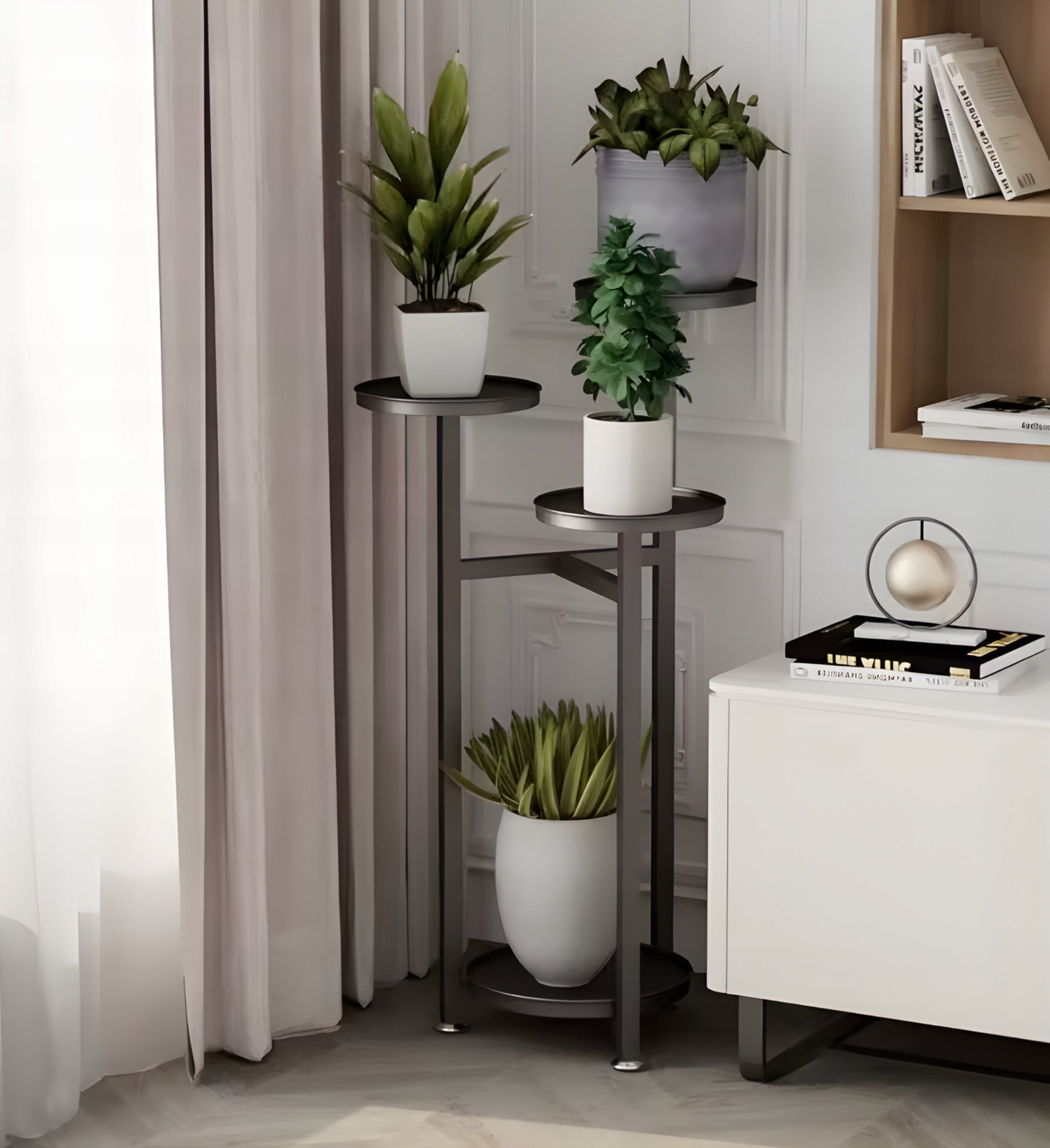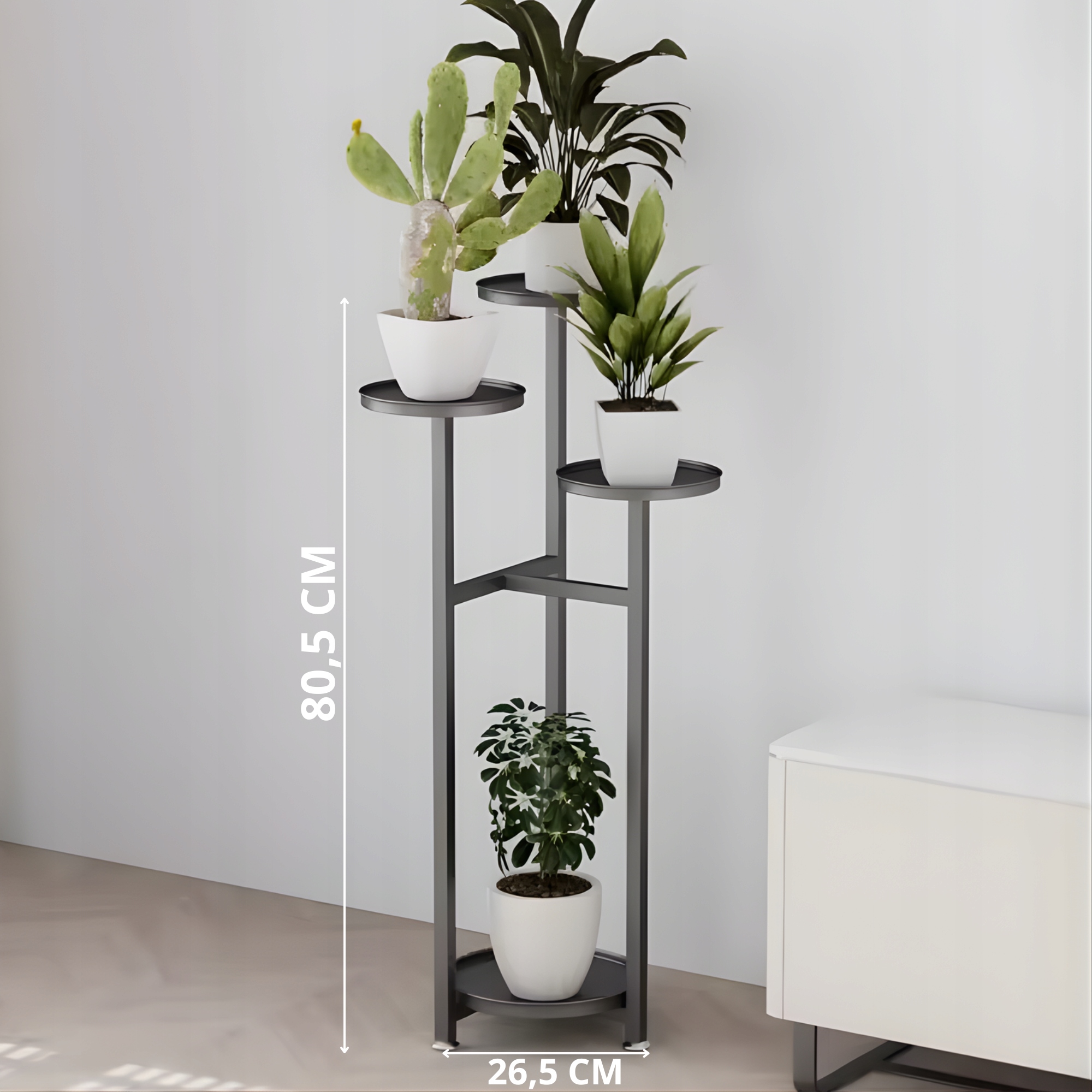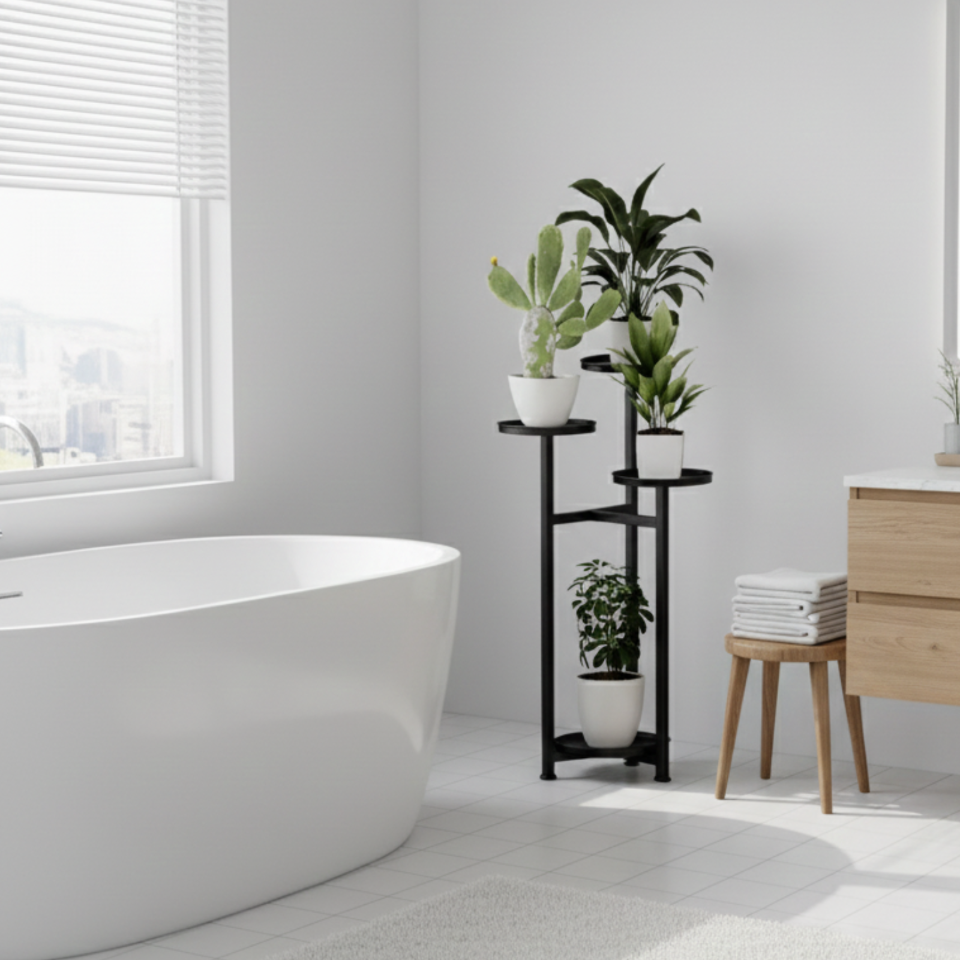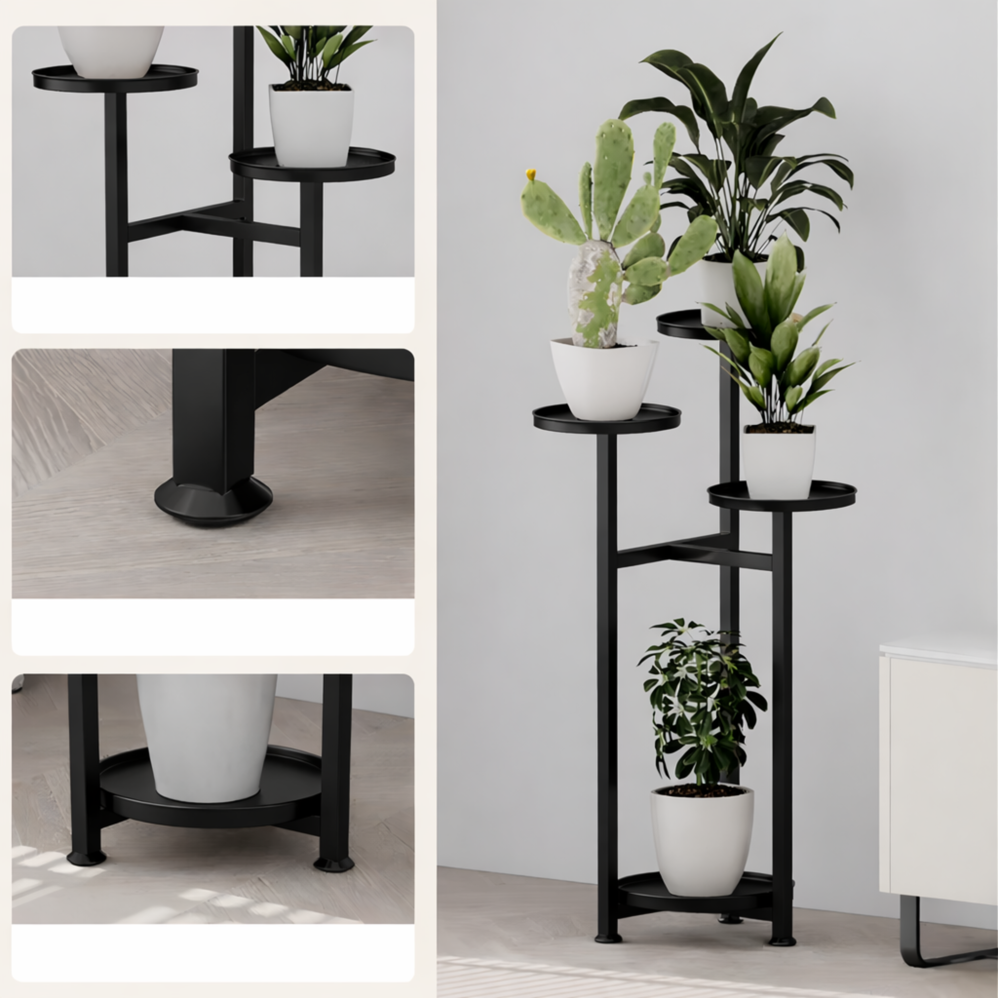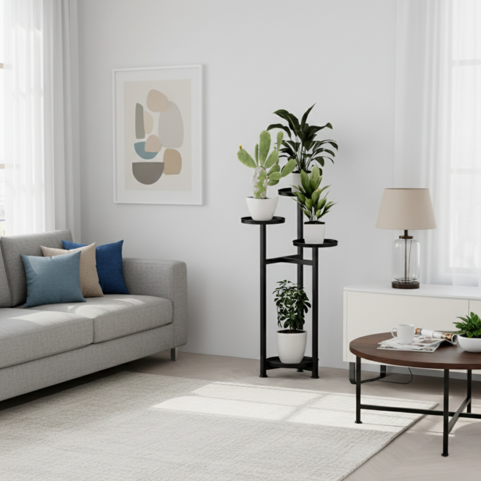 ☑️Kwietnik został zaprojektowany z myślą o stabilności i równomiernym rozmieszczeniu roślin. Metalowa rama zapewnia solidne podparcie dla doniczek umieszczonych na różnych poziomach. Taki układ pozwala na atrakcyjną ekspozycję roślin bez efektu przytłoczenia. Każda półka zapewnia odpowiednią przestrzeń dla doniczki. To praktyczne rozwiązanie do codziennego użytkowania.