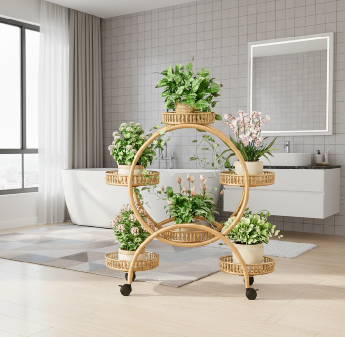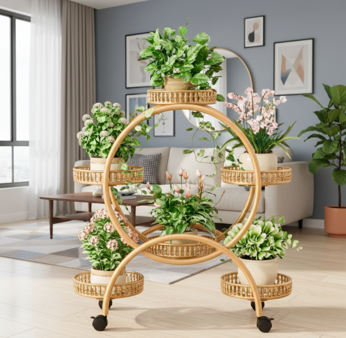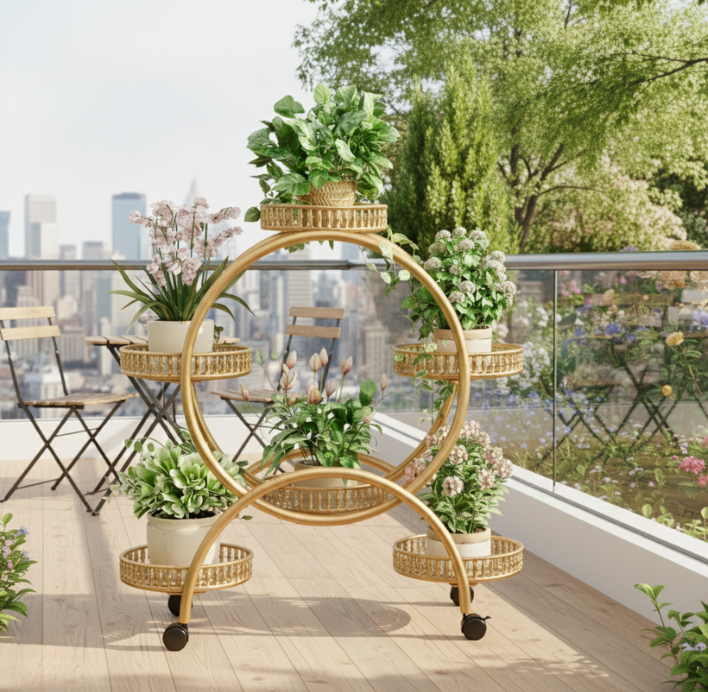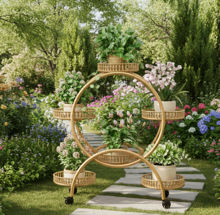 KWIETNIK STOJAK PIĘTROWY NA ROŚLINY KWIATY NA KÓŁKACH OKRĄGŁY ZŁOTY [KWIETNIK10]