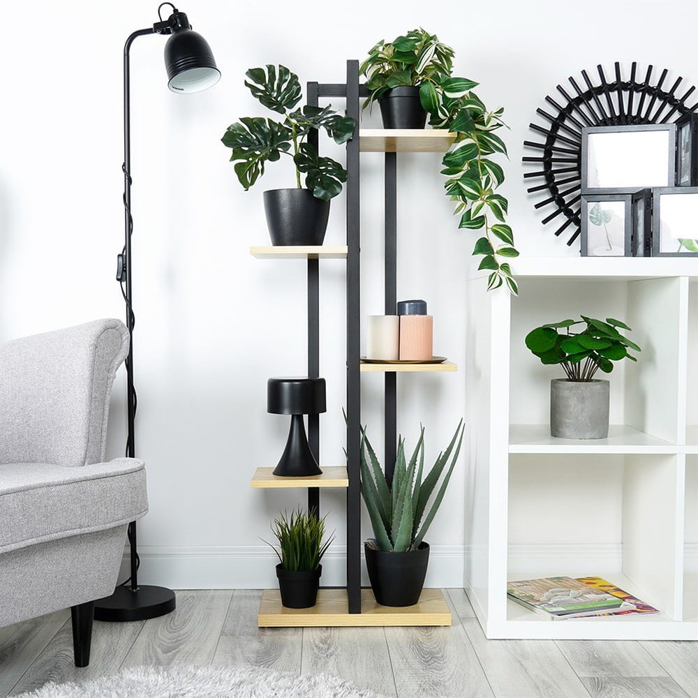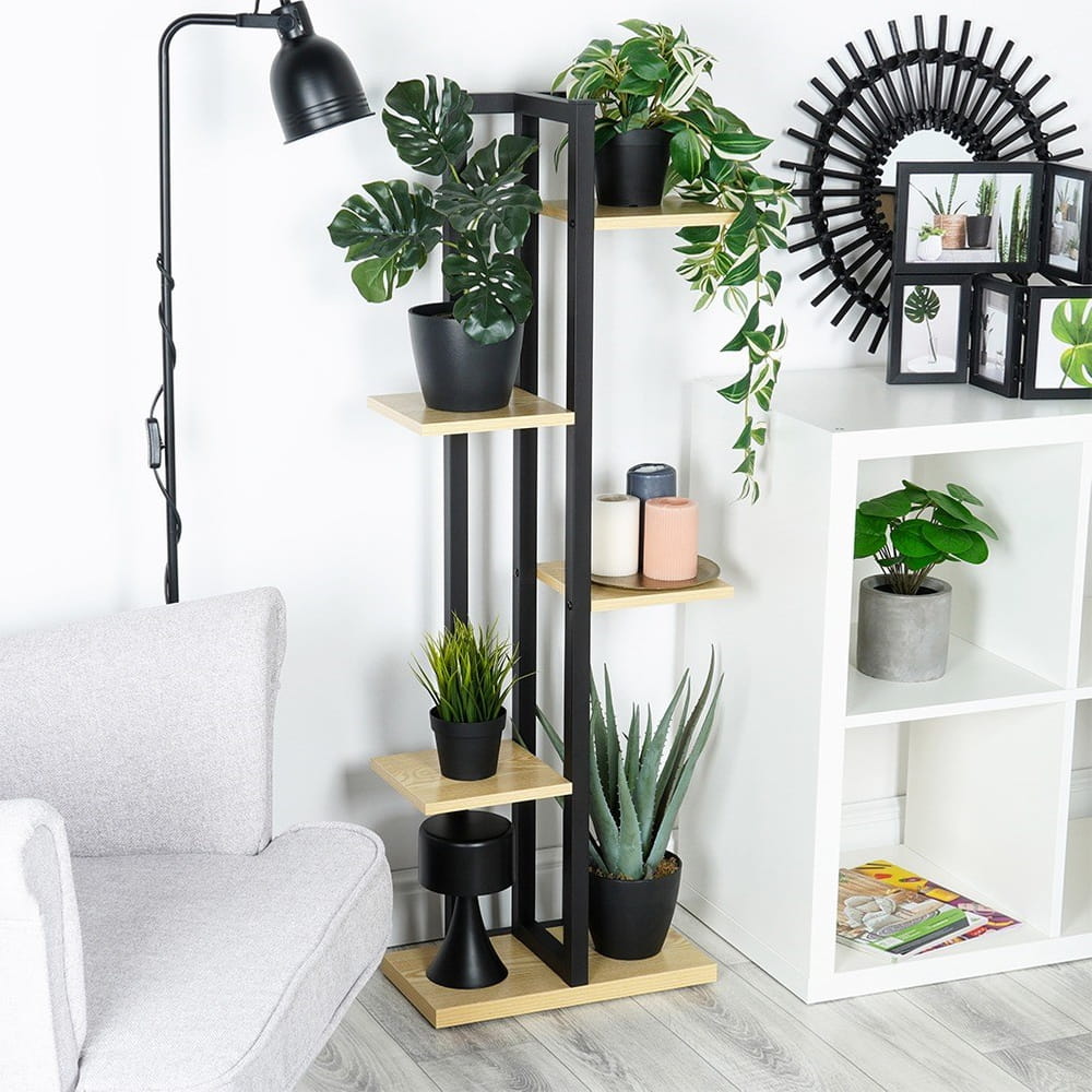 ✅ EFEKTOWNY - Stylowy kwietnik w formie wielopoziomowej kaskady, która posiada sześć miejsc na pięciu różnych poziomach do postawienia doniczek lub dekoracji. Kwietnik ma wymiary zewnętrzne: 43 x 23 x 116,5 cm. Maksymalne obciążenie kwietnika wynosi 60 kg. Nada wyjątkowego charakteru każdemu wnętrzu.