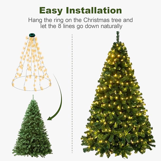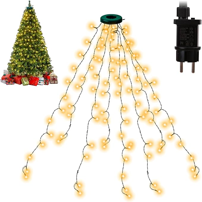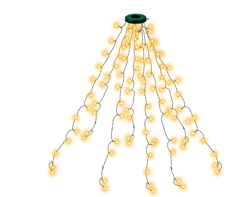 Oświetlenie choinkowe z pierścieniem, składające się z 16 pasm o długości 1,75 m każde, z całkowitą długością przewodu wtyczki 5 m. Nasze łańcuchy świetlne bożonarodzeniowe są łatwe w instalacji – po prostu umieść pierścień Halo na czubku drzewa i rozwieś łańcuchy świetlne, eliminując problem plątaniny kabli.