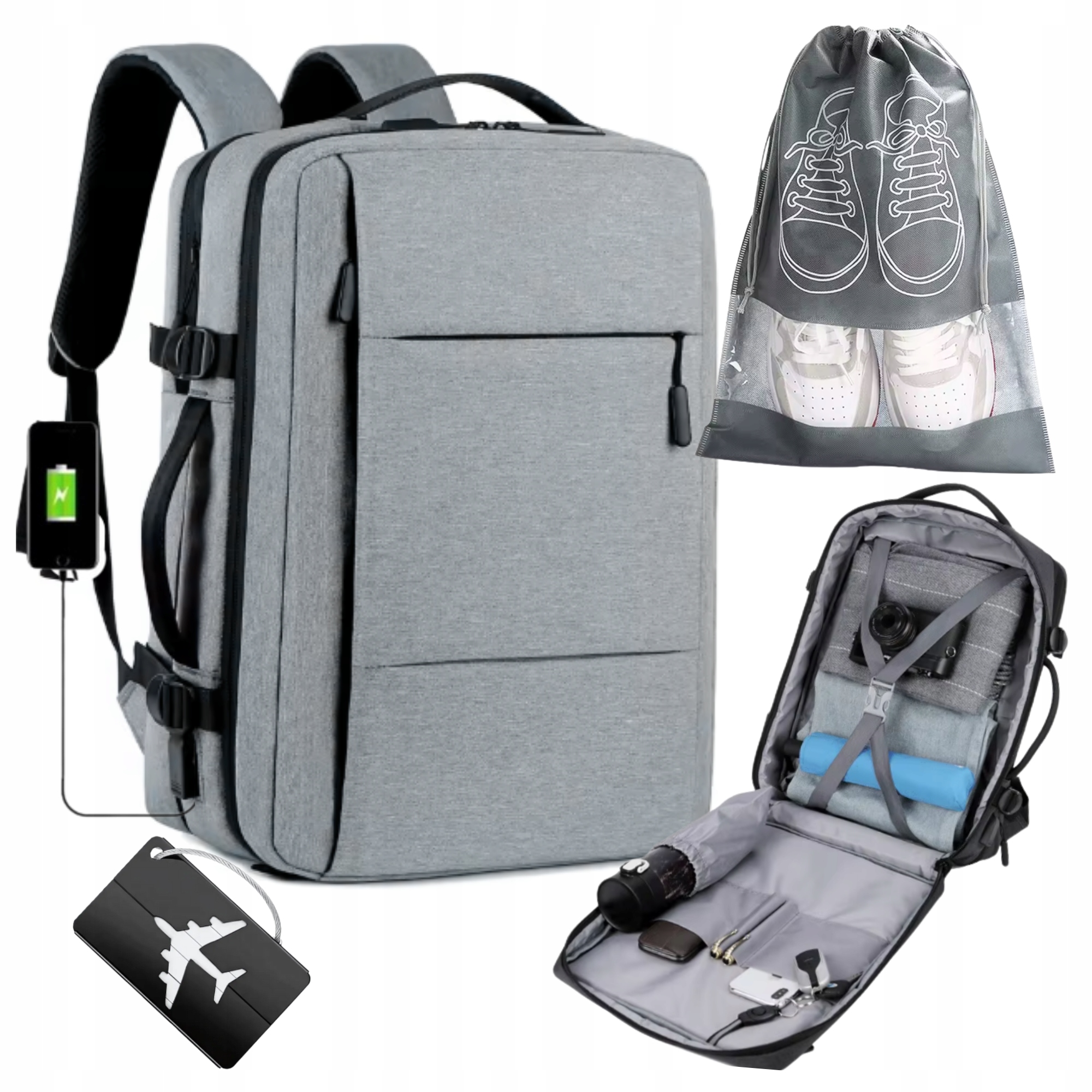 PLECAK DO SAMOLOTU TURYSTYCZNY RYANAIR 40x20x25 CM JASNY SZARY Z TORBĄ NA BUTY I ZAWIESZKĄ [PLECAK121]