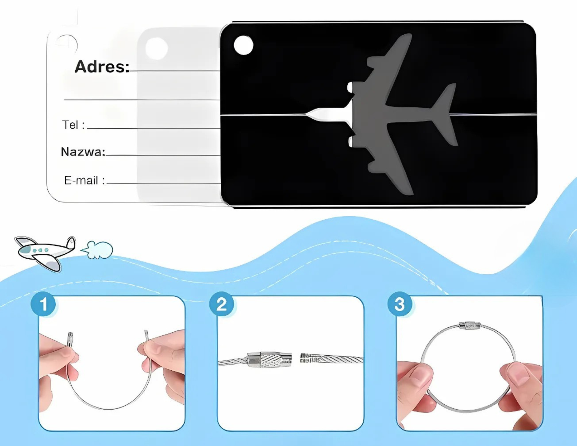 ☑️ Funkcjonalna zawieszka stworzona z myślą o wygodnym i bezpiecznym podróżowaniu. Składa się z osłony z motywem samolotu oraz karty, na której można wpisać dane kontaktowe właściciela. Dzięki temu bagaż jest łatwy do zidentyfikowania w przypadku zagubienia.