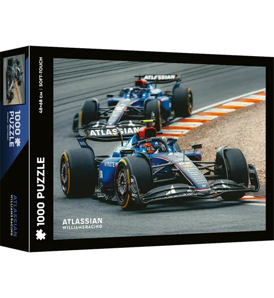Puzzle Atlassian Williams Racing to układanka 1000 elementów, która przedstawia szczegółową grafikę bolidu Williams FW47 na sezon 2025. Idealna dla fanów zespołu i kolekcjonerów Formuły 1. Po ułożeniu obraz ma wymiary 48 × 68 cm, co czyni go doskonałym do oprawienia i ekspozycji. Puzzle wysokiej jakości z wykończeniem soft touch, co zapewnia miękką, matową powierzchnię i intensywne kolory detali auta oraz logo zespołu. To świetny prezent i unikatowy gadżet dla miłośników motorsportu, układanek i kolekcji F1.