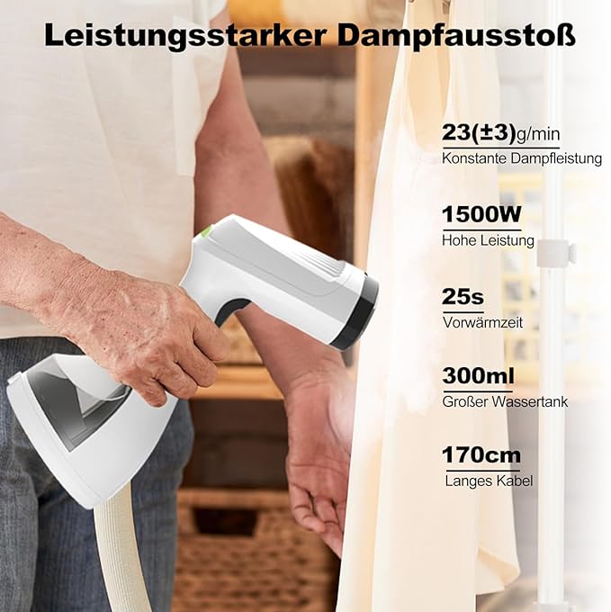 Skuteczne usuwanie zmarszczek: Wyposażona w moc 1500 W, parownica nagrzewa się w zaledwie 25 sekund, generując 23 (± 3) g/min sprayu wysokotemperaturowego. Idealna do szybkiego i efektywnego usuwania zagnieceń z różnorodnych materiałów, w tym bawełny, wełny, jedwabiu i włókien syntetycznych.