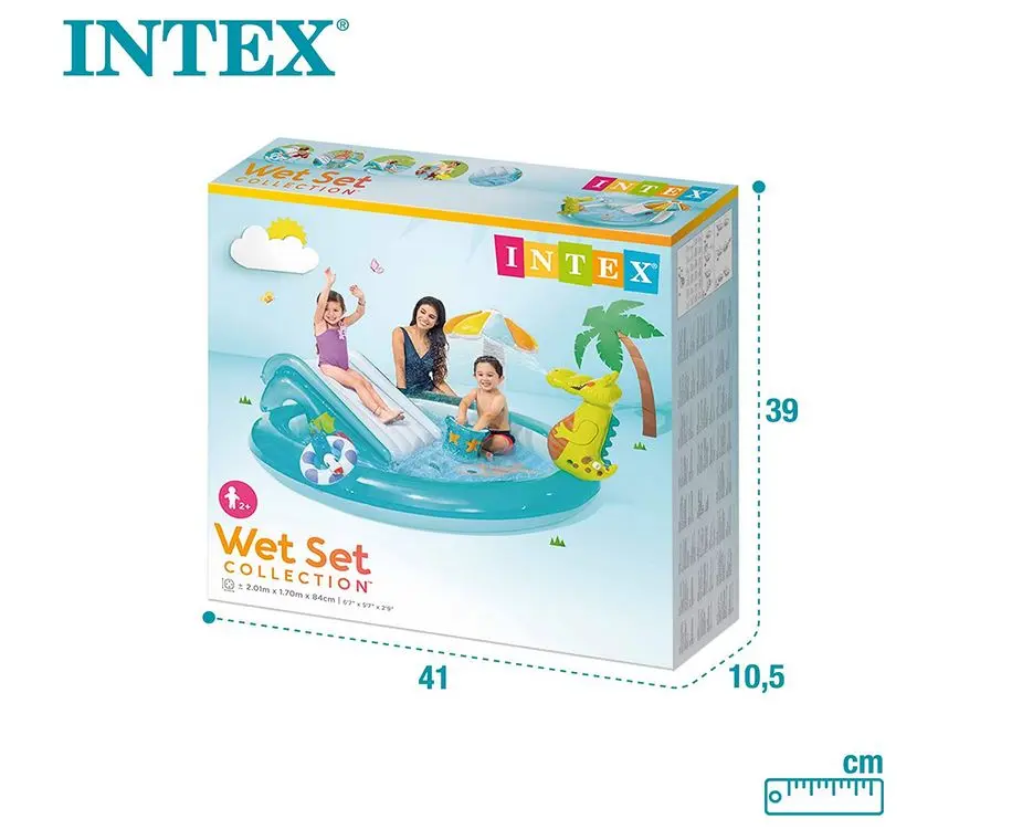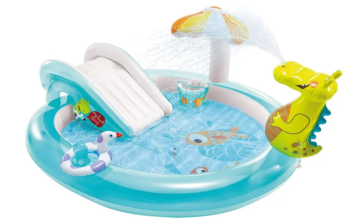 Dmuchany plac zabaw Krokodylek idealnie nada się już dla najmłodszych dzieci! Na pokładzie Krokodylka znajdziemy oczywiście fontannę krokodyla, do którego wystarczy podłączyć wąż ogrodowy, grzybka -parasol, kaczkę do rzucania na słupek oraz wiadro rybaka! Największą atrakcją jest zjeżdżalnia, która dzięki macie na dole zapewnia bezpieczne zjazdy. Basen posiada stabilną konstrukcję i wykonany jest z winylowego, solidnego materiału. Całość można z łatwością zamontować. Posiada łatkę naprawczą w zestawie.