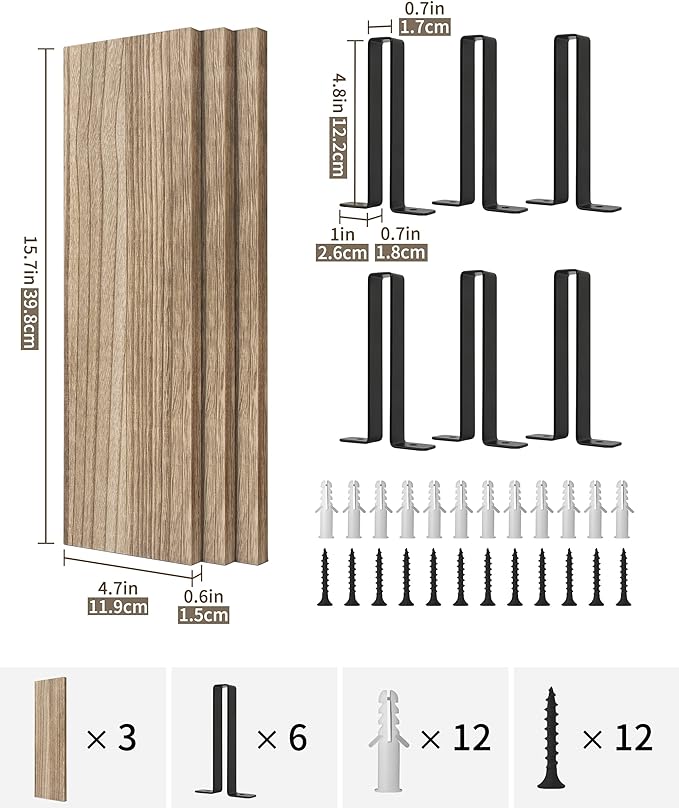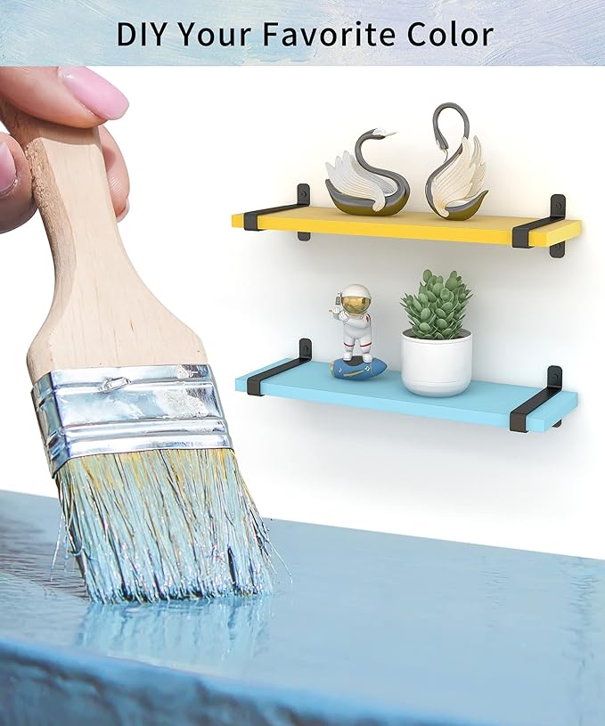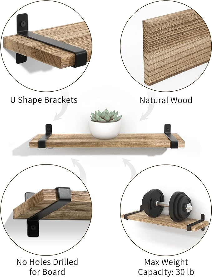 - Drewniane półki pływające z unikalnymi czarnymi wspornikami.