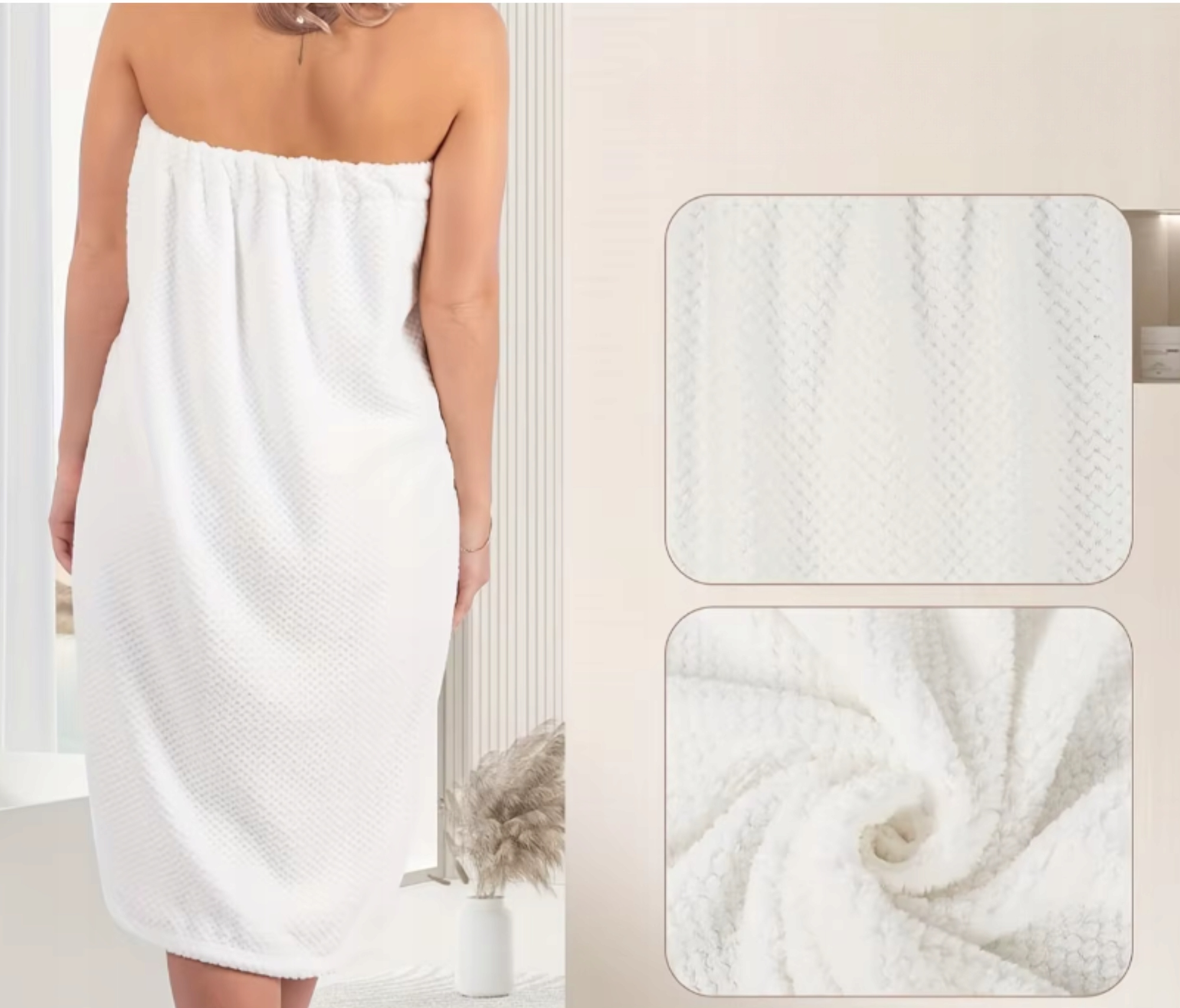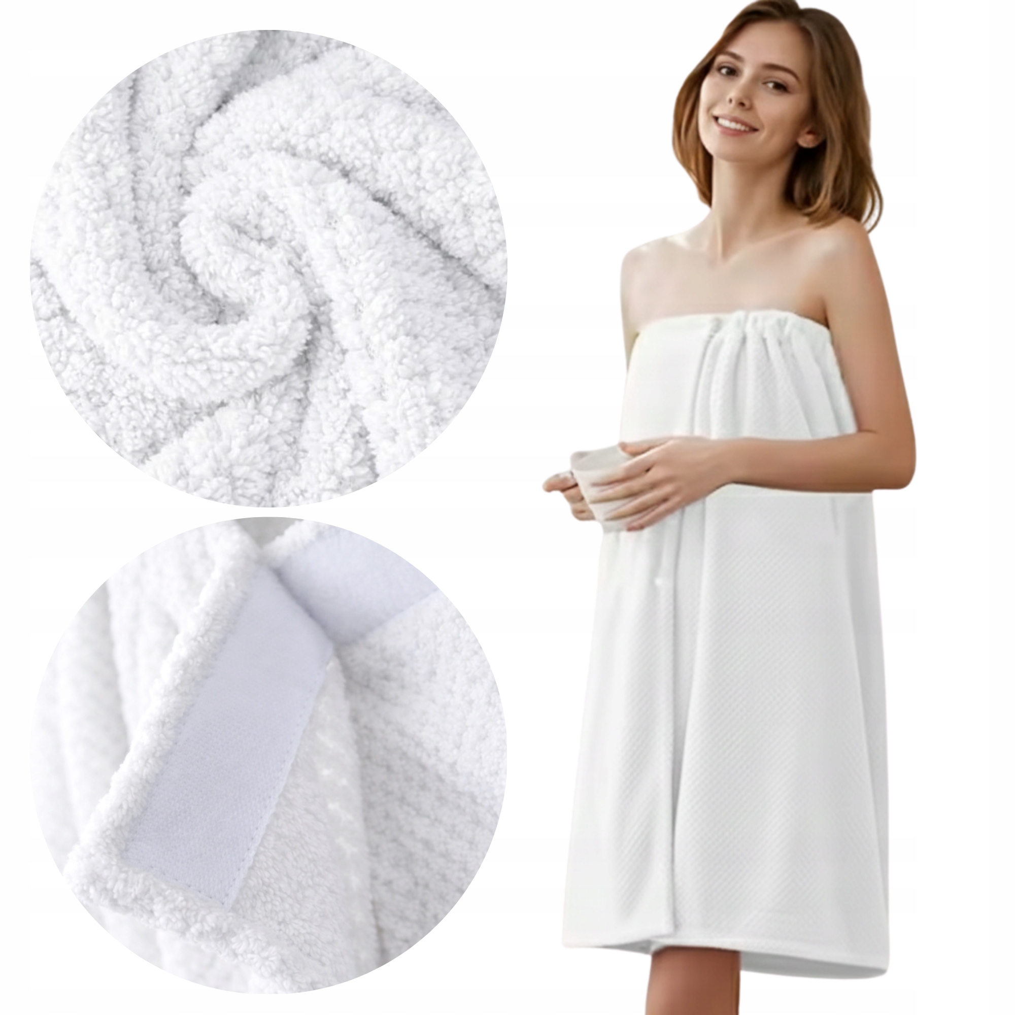 ☑️Ręcznik został wyposażony w praktyczne zapięcie na rzep oraz guzik, które umożliwia szybkie i łatwe zakładanie. Dodatkowa elastyczna gumka sprawia, że ręcznik dobrze trzyma się na ciele i nie zsuwa się podczas użytkowania. Takie rozwiązanie zapewnia swobodę ruchów i poczucie komfortu. Możesz bez obaw wykonywać codzienne czynności po kąpieli. Zapięcie pozwala dopasować ręcznik do różnych sylwetek. To funkcjonalność, którą docenisz od pierwszego użycia.