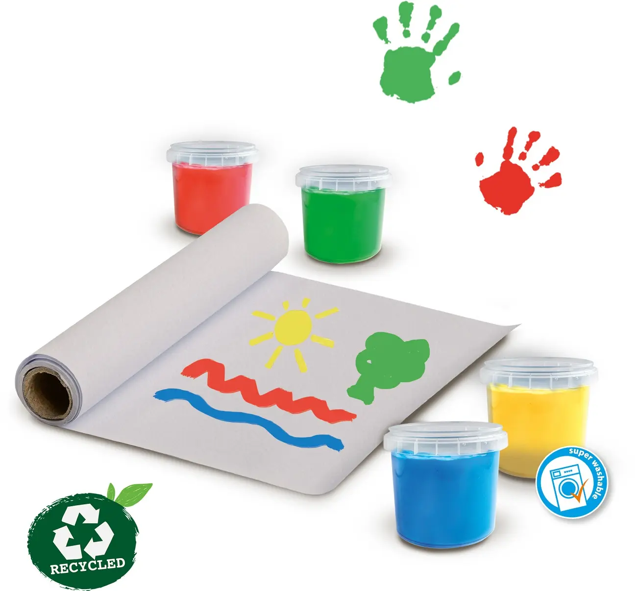 Zestaw wykonany 100% z recyklingu; zawiera różne kolory farb do malowania palcami, fartuch i rolkę papieru, na którym możesz tworzyć piękne dzieła sztuki.