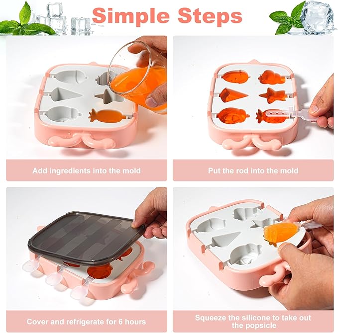Wysokiej jakości materiał: Foremki wykonane są z wysokiej jakości, bezzapachowego i bezpiecznego materiału PP. Podstawa foremki zrobiona jest z silikonu, co ułatwia wyjmowanie gotowych lodów.