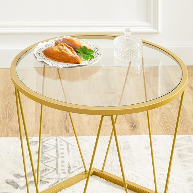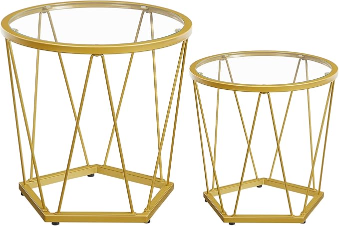 Wzbogać wystrój swojego domu dzięki temu zestawowi okrągłych stolików kawowych, które łączą w sobie różne nowoczesne elementy. Szklane, okrągłe blaty w połączeniu z wielokątną podstawą i złotą metalową ramą tworzą elegancki i wyrafinowany wygląd, który podkreśli styl i gust Twojego wnętrza.