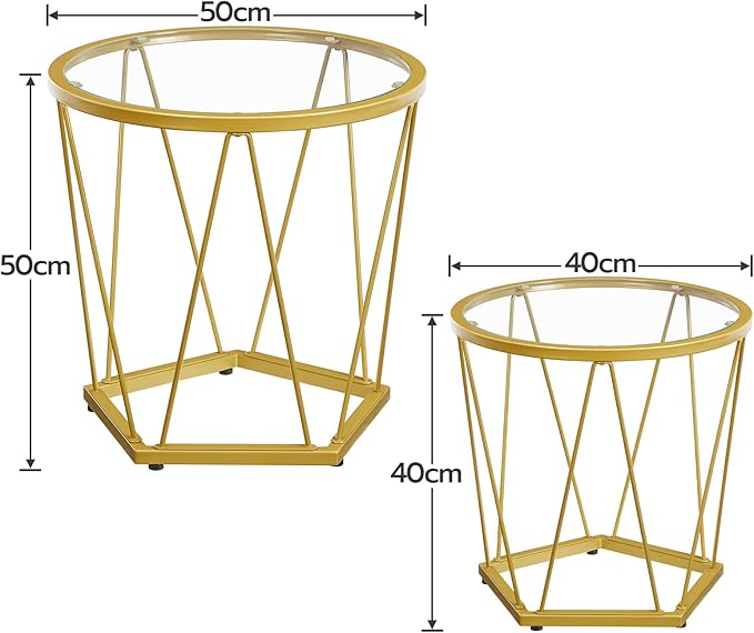 Wykonany z najwyższej jakości materiałów, ten zestaw stolików kawowych łączy solidną metalową ramę z hartowanym szkłem, co zapewnia trwałość i stabilność. Każdy stolik boczny ma nośność do 15 kg, co czyni go funkcjonalnym i wytrzymałym elementem wyposażenia.