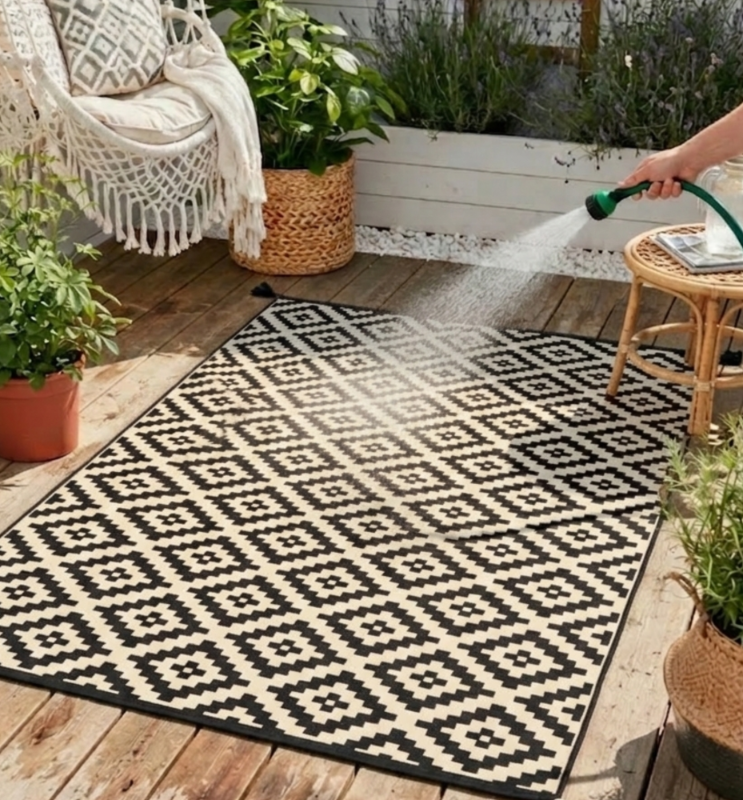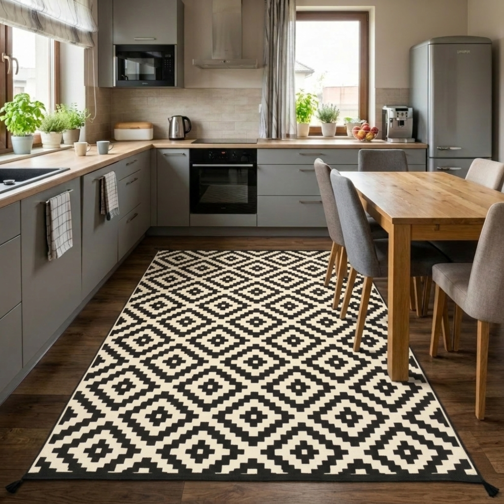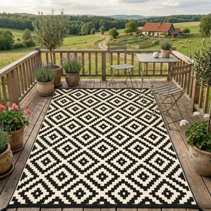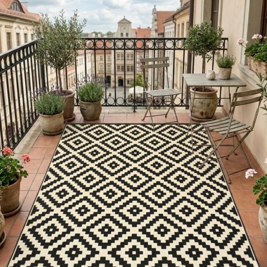 WODOODPORNY DYWAN TARASOWY ZEWNĘTRZNY 160x230 CM CZARNO-BEŻOWY ROMBY [DYWAN10]