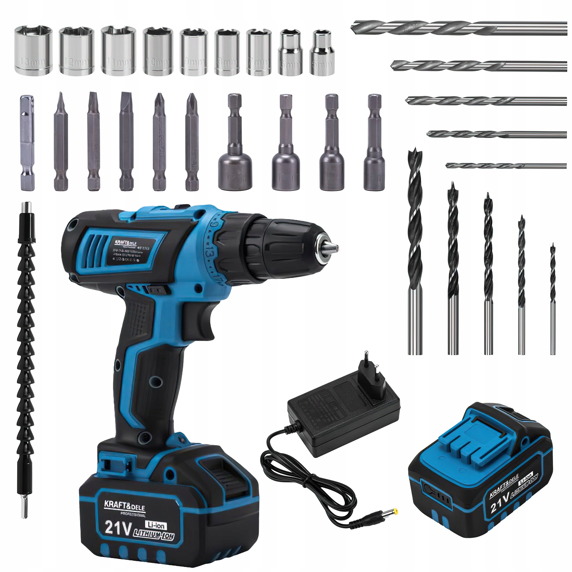 Wiertarko-Wkrętarka Akumulatorowa 21V 2Ah Kraft&Dele Zestaw 2x Bateria Ładowarka Wiertła Nasadki 34 Elementy