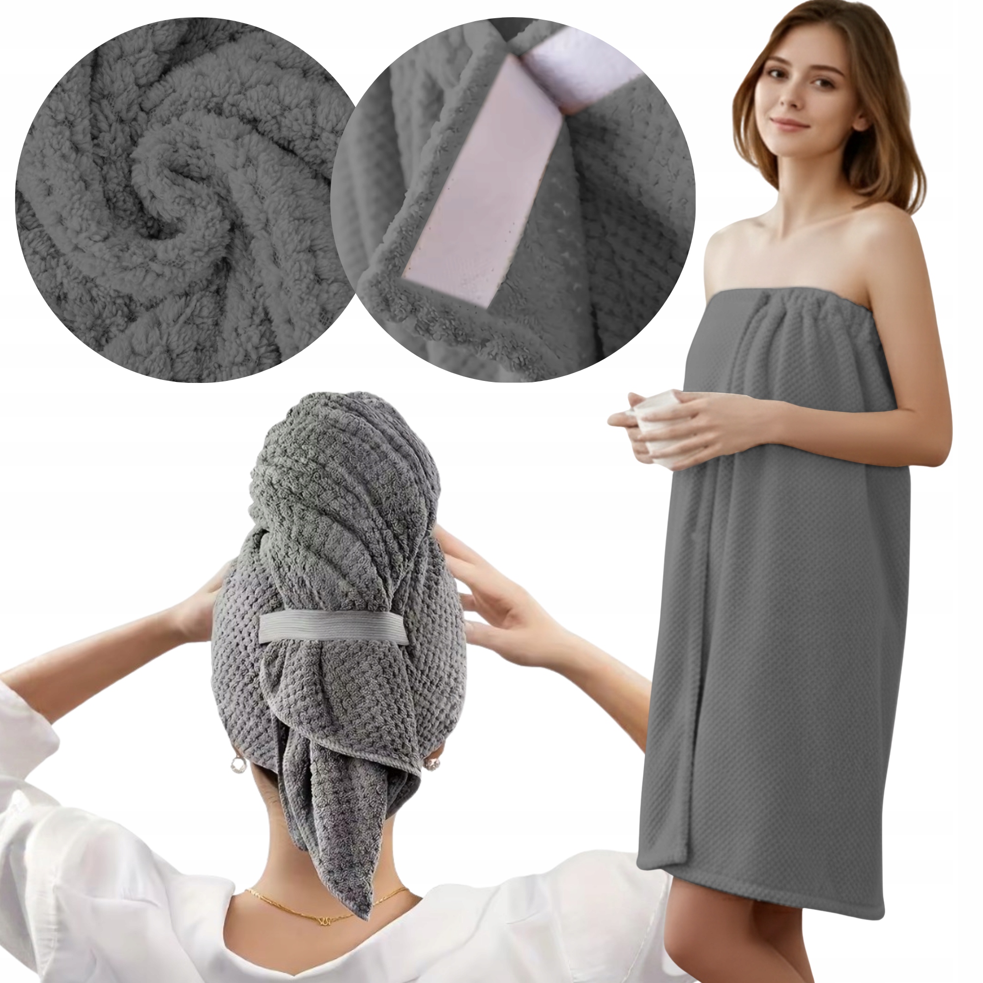 ZESTAW RĘCZNIK DO SAUNY TURBAN DO WŁOSÓW KOMPLET PAREO SZARY GRAFITOWY [RECZNIK6]
